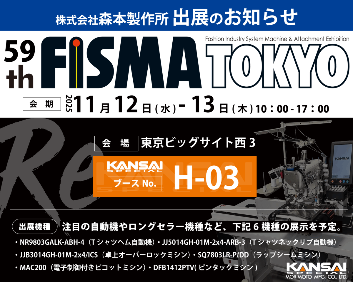 2025年11月12日(水)~11月13日(木)の期間、東京ビッグサイトで開催される「59th FISMA TOKYO(東京ファッション産業機器展)」に出展いたします。